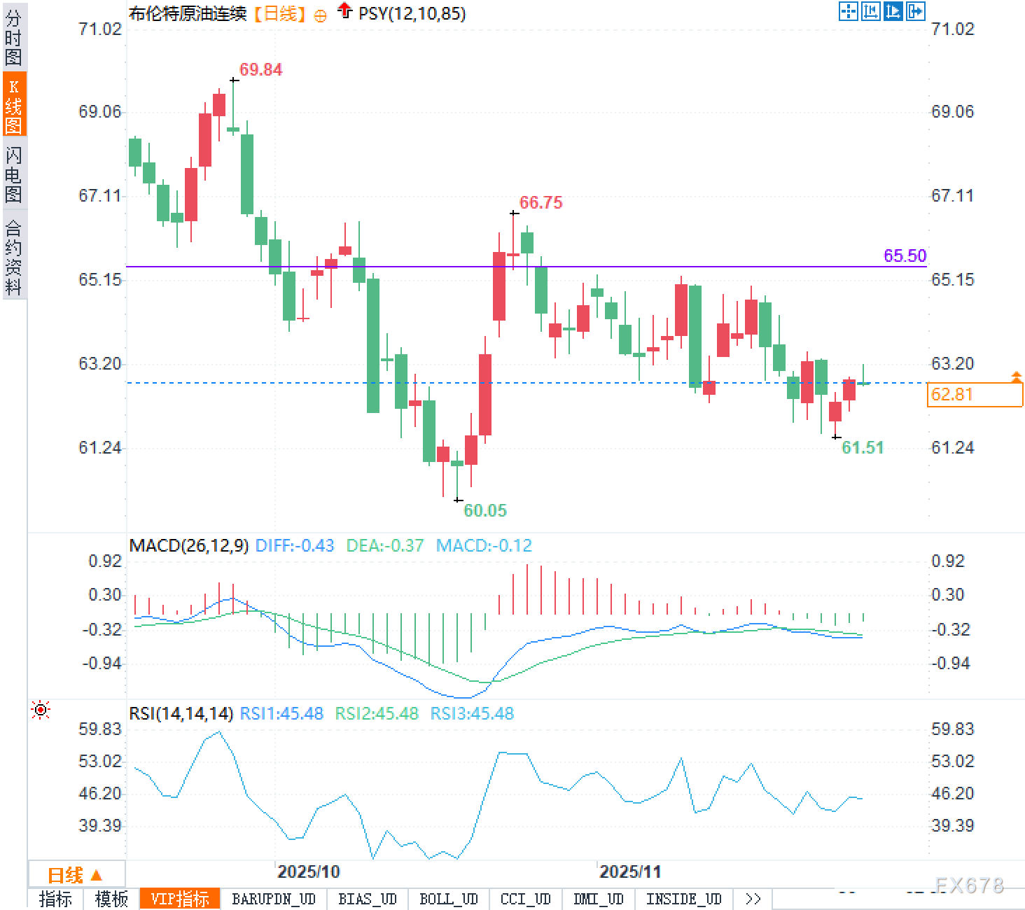 从当前布伦特原油的技术图形来看,价格在62.80美元附近波动。整体趋势在最近一段时间出现了震荡调整。首先,从日线图中可以看到,布油价格曾一度触及69.84美元的高点,但随后逐渐回落至60美元附近,并在61.51美元的支撑位附近稳定反弹。当前价格接近65.50美元的压力位,短期内可能会面临一定的卖压。
