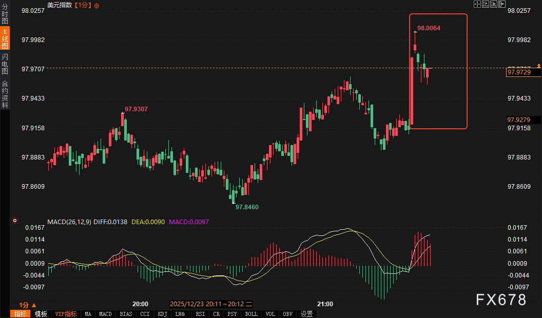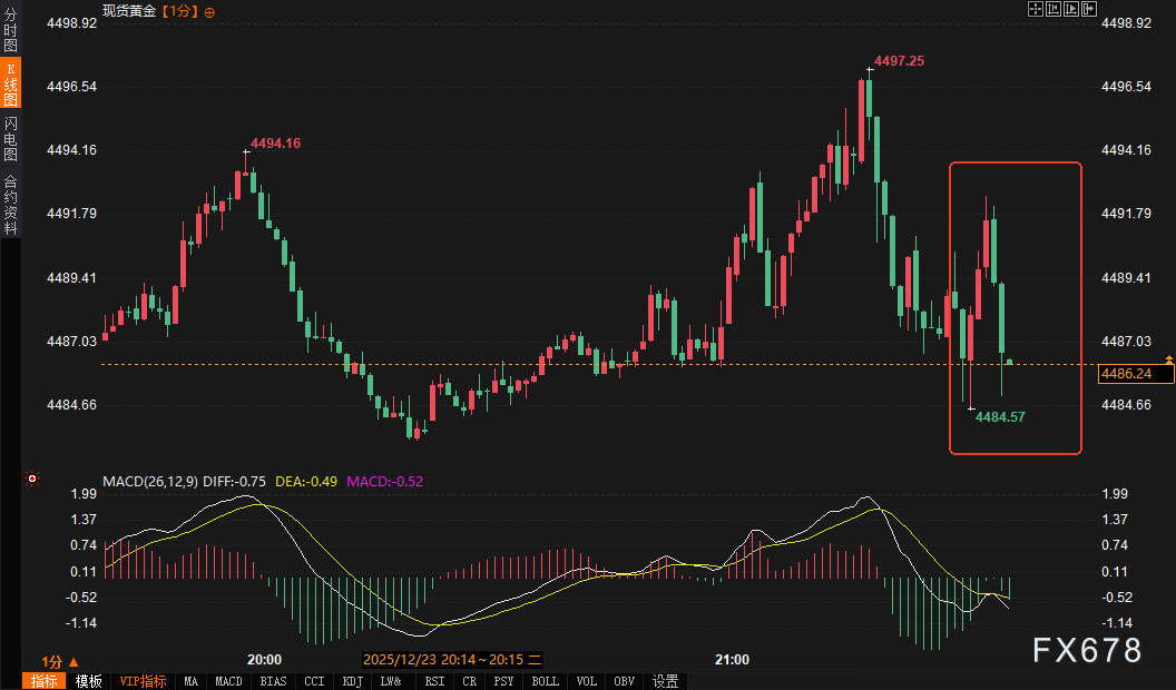 数据公布后,金融市场反应迅速且剧烈。美元指数(DXY)应声冲高,短线最高触及98.0064,但涨势未能持久,迅速回落至97.9345附近。现货黄金的反应则更为典型地体现了“买预期,卖事实”与数据矛盾解读的交织:金价先是短线急挫,最低触及4484.41美元/盎司,随后快速反弹,收复大部分失地,最新报价回升至4488.39美元/盎司,在分时图上呈现显著的“V型”震荡。