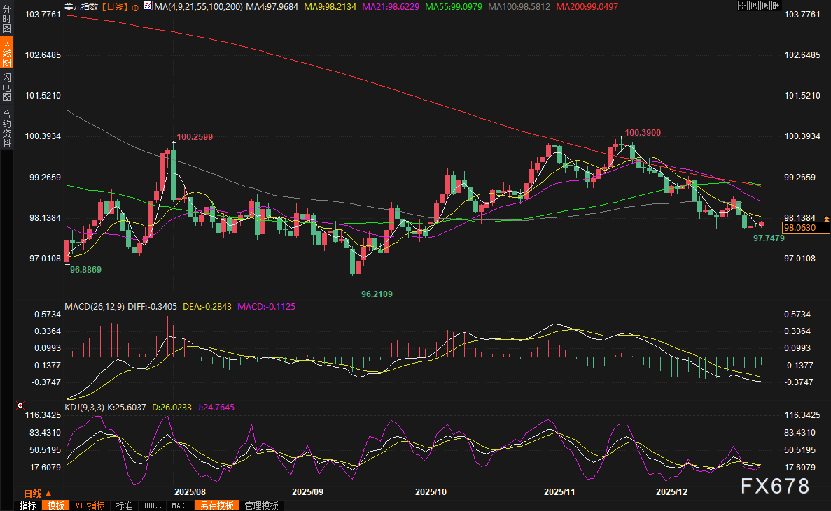 汇通财经APP讯——2025年即将画上句号,而美国美元指数(DXY)却以一种戏剧性的方式收尾。截至2025年12月26日,美元指数徘徊在98点附近,全年累计下跌约9.3%至9.7%,这不仅是自2017年以来最严重的年度跌幅,甚至可能接近2003年以来的最大年度损失。这种大幅下滑并非突发事件,而是多重因素交织的结果,包括美联储的宽松预期、政策不确定性、地缘政治紧张以及其他央行政策的分化。它不仅重塑了全球货币格局,还为2026年的投资景观带来了深刻变革。