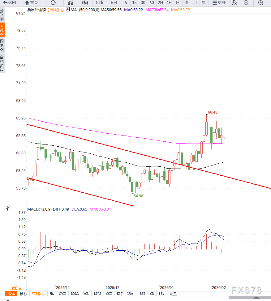 上方阻力方面,64.50美元为短线第一阻力位,该水平叠加短期均线压制,限制反弹空间。若油价反弹站稳该位置,进一步阻力位将指向65.80—66.25美元区间,该区域为前期阶段性高点所在,也是当前调整结构的关键压力带。